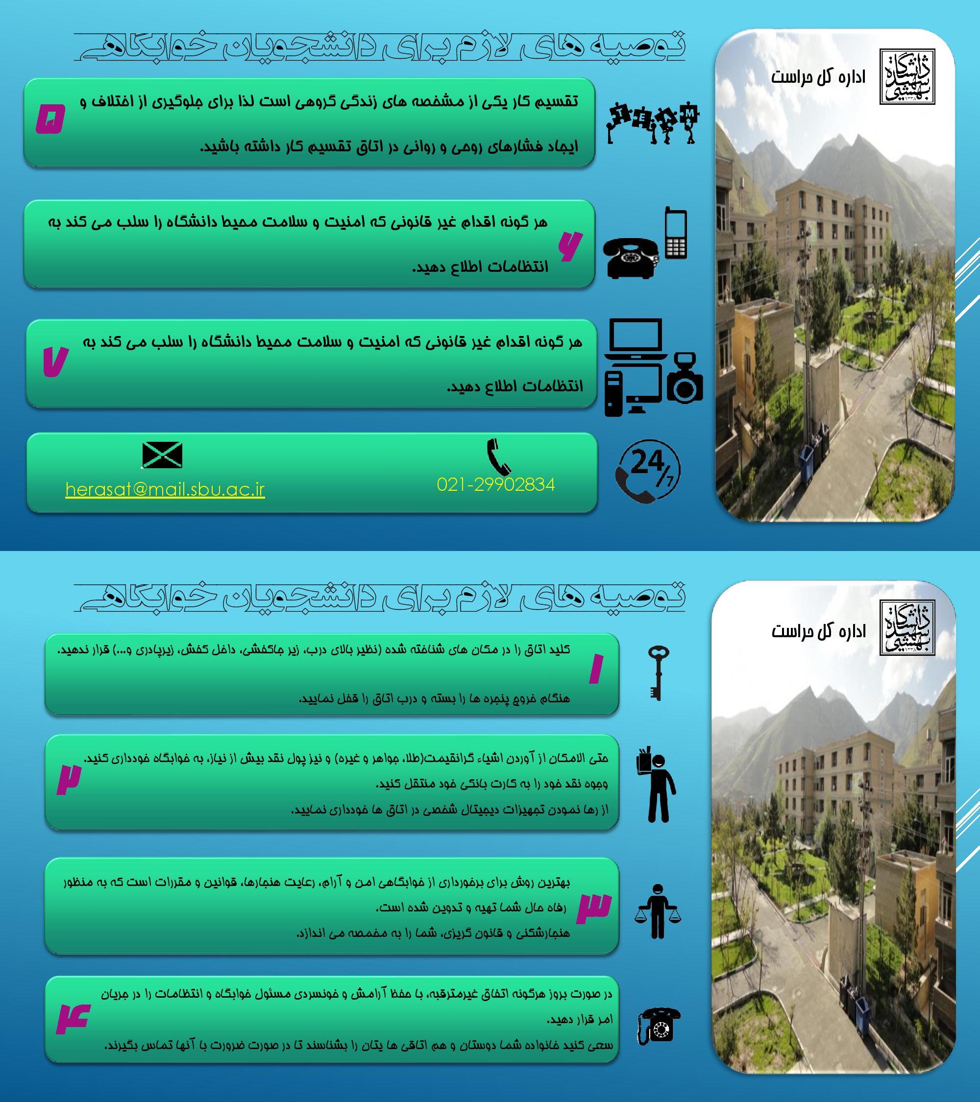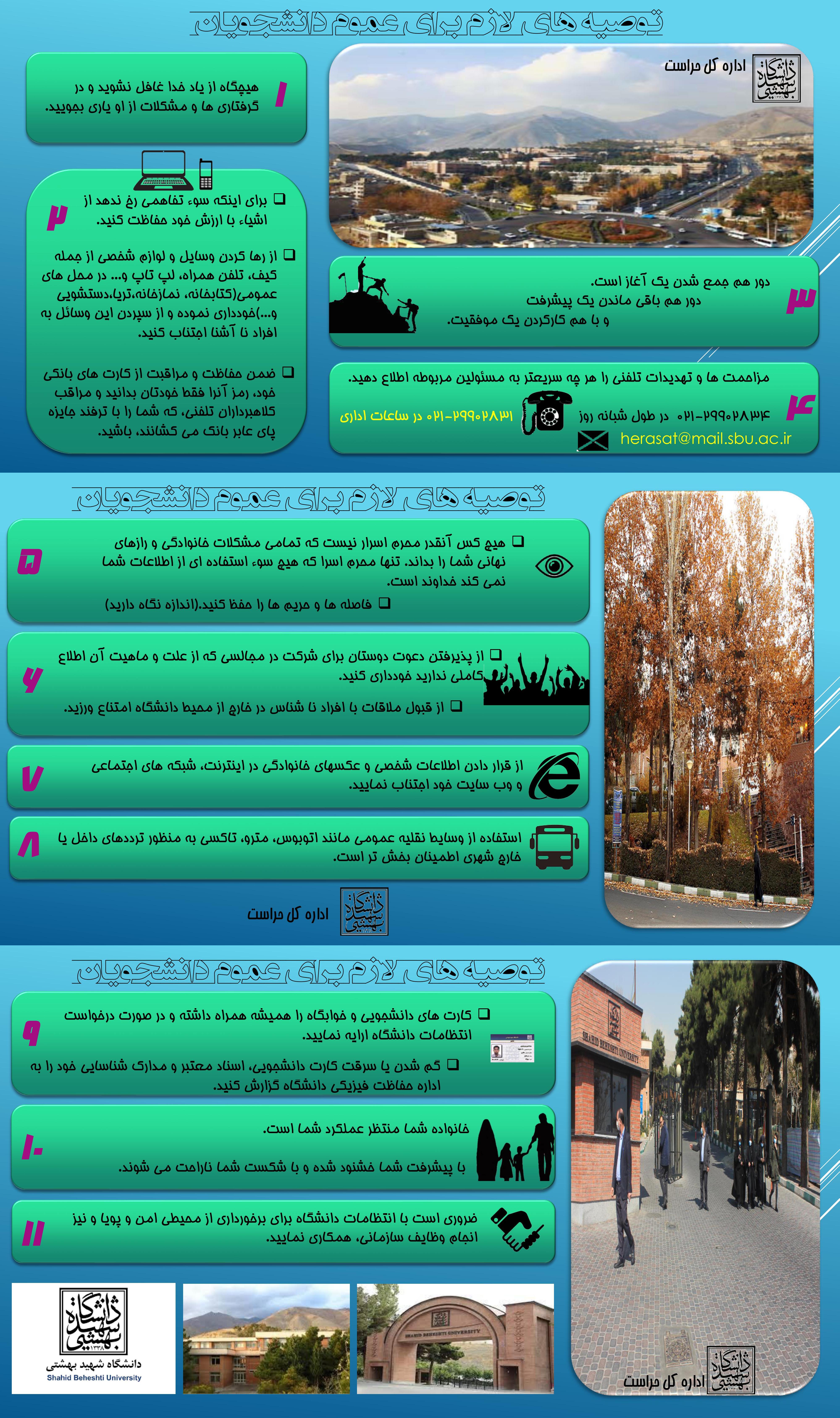اطلاعنوشتها (اینفوگراف) ی زیر حاوی توصیههای مهم امنیتی و مراقبتی برای عموم دانشجویان است تا بتوانند دوران دانشگاهی خود را به سلامت و در آرامش سپری کنند.
