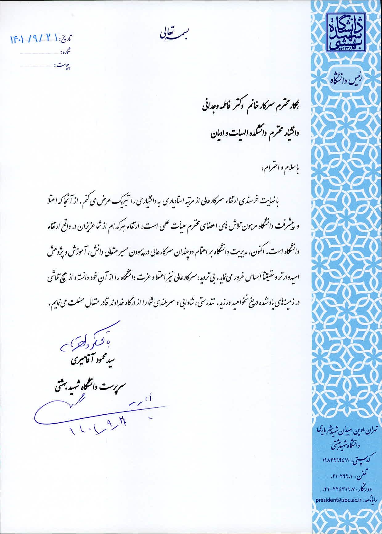 دکتر سید محمود آقامیری، رئیس دانشگاه شهید بهشتی، با ارسال پیامی ارتقاء مرتبه علمی دکتر فاطمه وجدانی، عضو هیات علمی دانشکده الهیات و ادیان را از استادیاری به دانشیاری تبریک گفت. متن پیام به شرح زیر است: